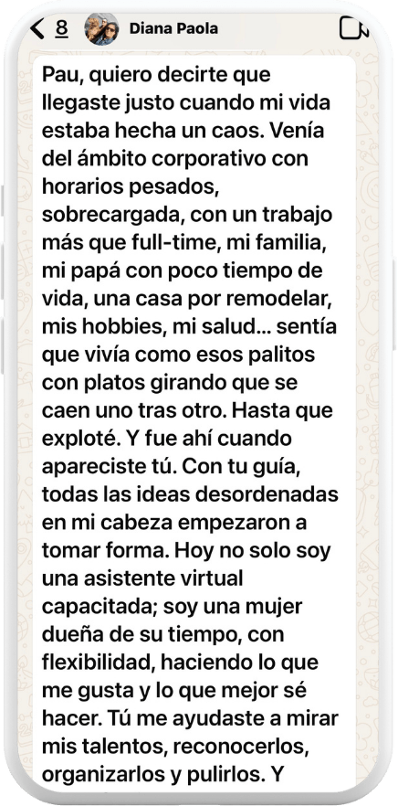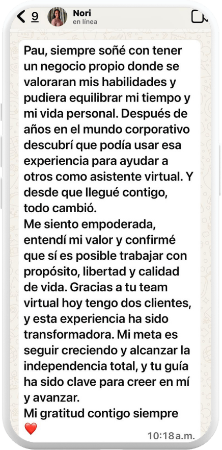 En ese camino formé a mi propio equipo dentro de mi agencia Top Va Services, personas que hoy son Asistentes Virtuales profesionales gracias a los procesos, estándares y entrenamientos que desarrollé trabajando con clientes reales.